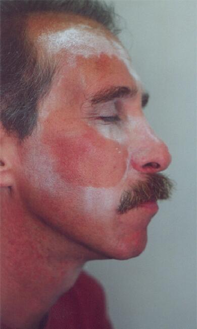 STEP 1: Hold the appliance against the face to determine the proper placement and lightly powder around the edge of the latex. Lift the appliance revealing an outline of the edge on the skin.