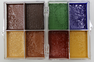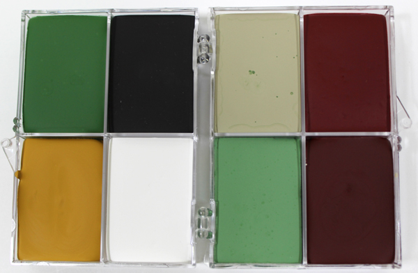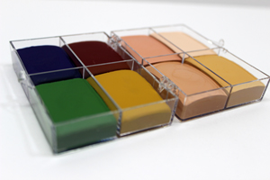 8 color palettes of Castor oil based rubber mask grease foundation for use as a prosthetic makeup. Use straight from the pot. Can be mixed with Silicolor to make Duracolor, a quick alcohol activated PAX-like fixed foundation that is smudgeproof, waterproof, and sweatproof, yet removable with soap and water. Available in 50 individual colors as well as palettes. (see Main color chart). Individual Colors: 1/2 oz. $8.00, 1oz. $12.00, 2oz $20.00, |